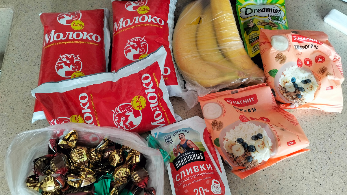 Вот эта кучка вышла на 820 рублей. Молоко, сливки, творог, бананы. Немного конфет, возможно, дети придут на праздник. И вкусненькое кошке)