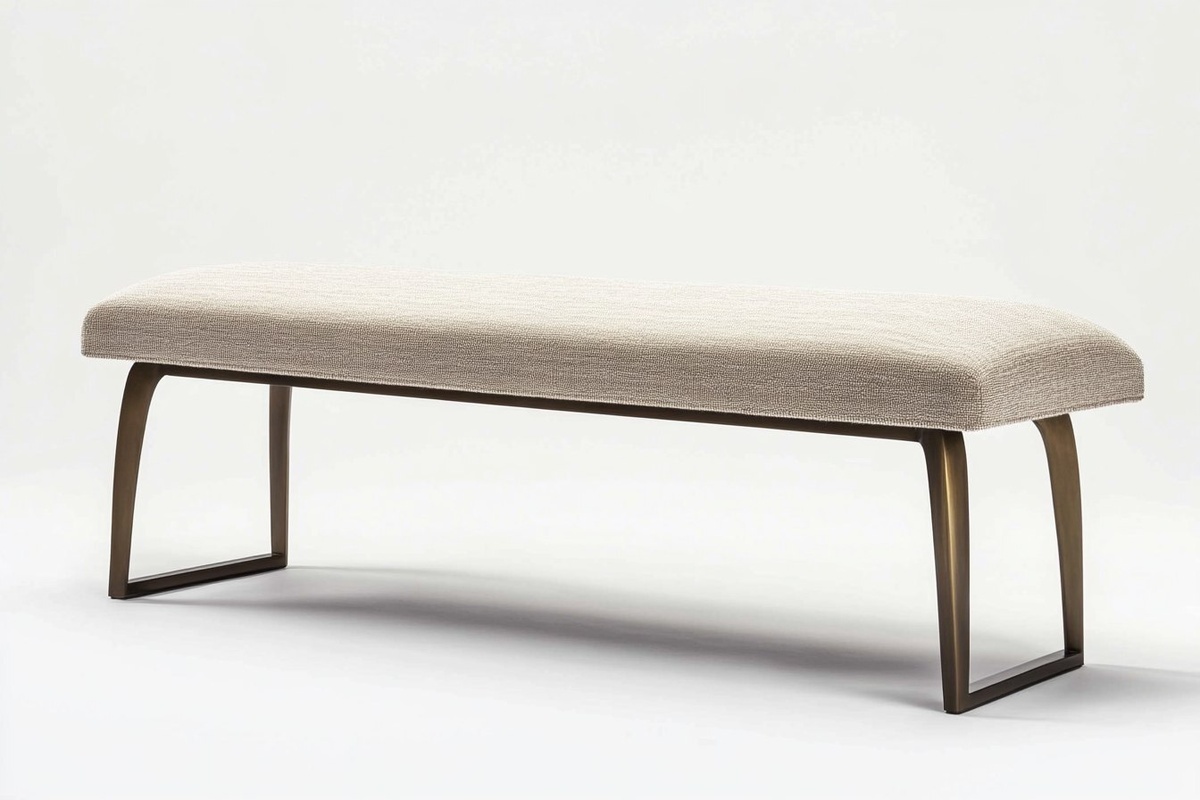 Создано на основе запроса: arched down seat minimalist beige fabric bench, slightly vintage style, with very dark brass legs, seating is