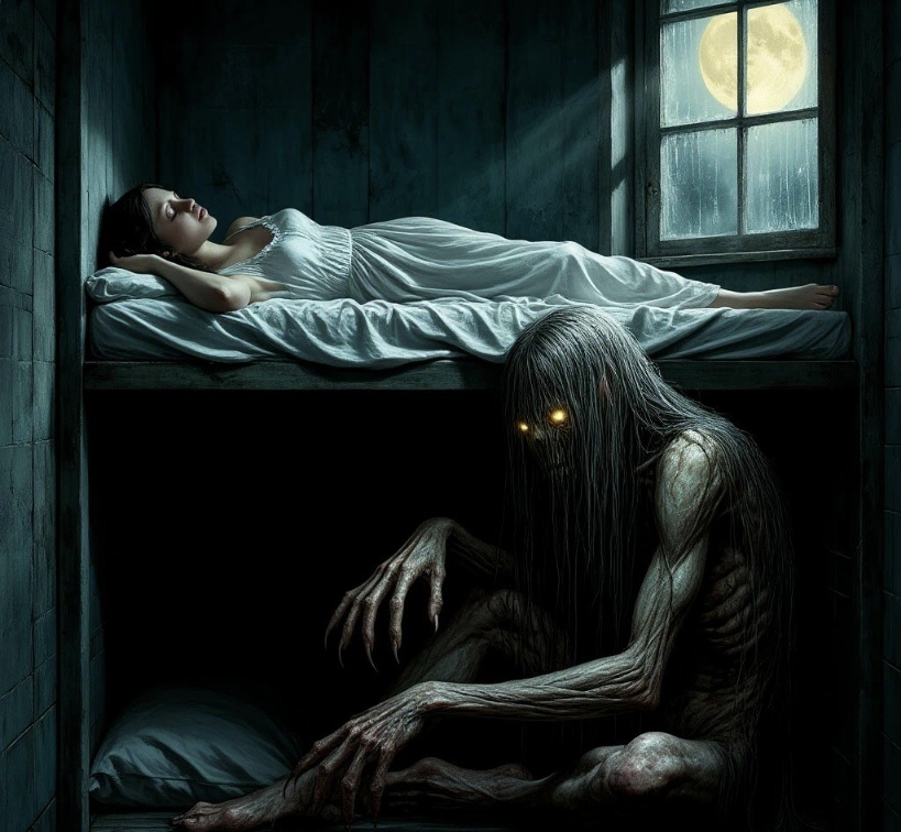 Сначала ей показалось, что кто-то вошел -дверь ведь не запиралась. Она подумала, что это бабушка или дед. Но, открыв глаза, увидела в тусклом лунном свете необычное существо. Оно сидело на нижнем полке - мерзкое, тщедушное, низкое. Его голое тело было покрыто. длинными редкими волосами. Оно пристально смотрело на женщину.