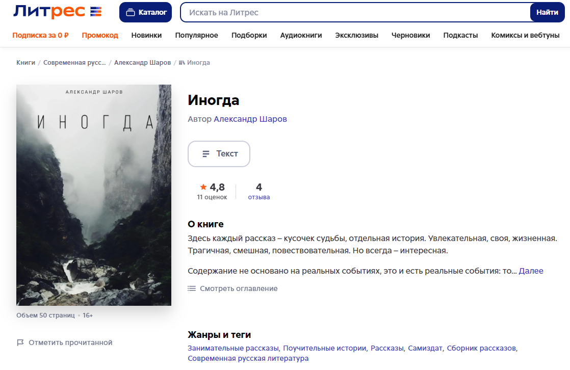 Для площадки выбрал Литрес — бесплатно и более-менее понятно, что и как делать для публикации. В 2025 году обновил сборник — добавил еще шесть рассказов и несколько цитат.