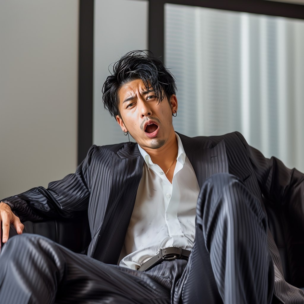 Создано на основе запроса: Very handsome Japanese man,Shiny navy suit,bel, necklacet
