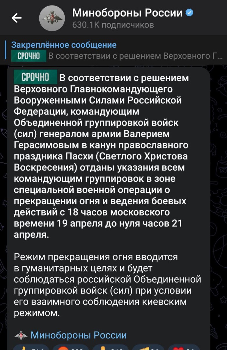 Заявление Путина о перемирии немного расходится с заявлением МО России. В любом случае, Путин пошел на шаг, который от него никто не ожидал. CNN пишет, что Уткофф готовится к новой поездке в Москву для уточнения рамок урегулирования. Как вы сами можете убедиться, мы идем точно по модели-прогнозу урегулирвания, который я опубликовал 4 февраля. Про перемирие 20 апреля там было указано.