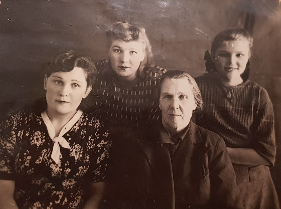 Даже сохранилась фотография, где бабушка (справа) со своими сестрами и мамой, урожденной Аньшаковой Анастасией Илларионовной, корни которой, по воспоминаниям, из Курской области.