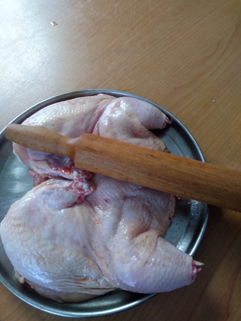 Мама советует или даже настоятельно рекомендует сначала тушку цыплёнка подготовить - хорошенько поколотить её скалкой, чтобы цыплёнок совершенно точно никуда не делся со сковороды, как его сородич из известной песенки...