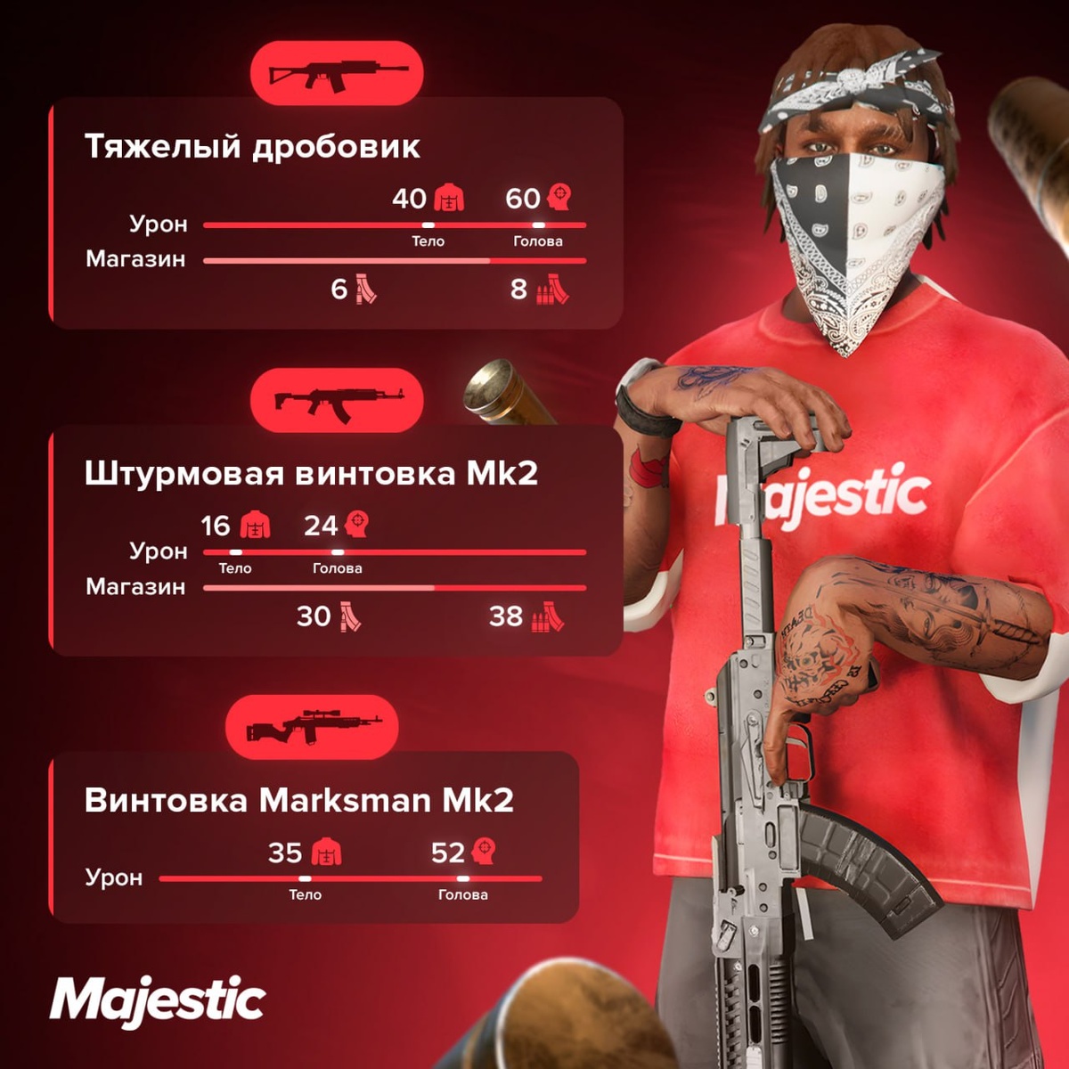🤨 Тяжелая винтовка — ВСЕ? Пора искать новую мету C новой системой она может впервые потерять свой титул, ведь теперь урон распределяется иначе: • голова: 50% по броне, 50% по hp; • ноги: 40% по hp, 60% по броне; • руки: 20% по hp, 80% по броне; • торс: сначала урон идет в броню, а потом в здоровье. Сравнили на картинах лучших в каждой категории — урон в тело и голову, объём магазина с обвесом и без. Скинь другу, который до сих пор бегает с револьвером 😅 ❤️ Majestic Role Play