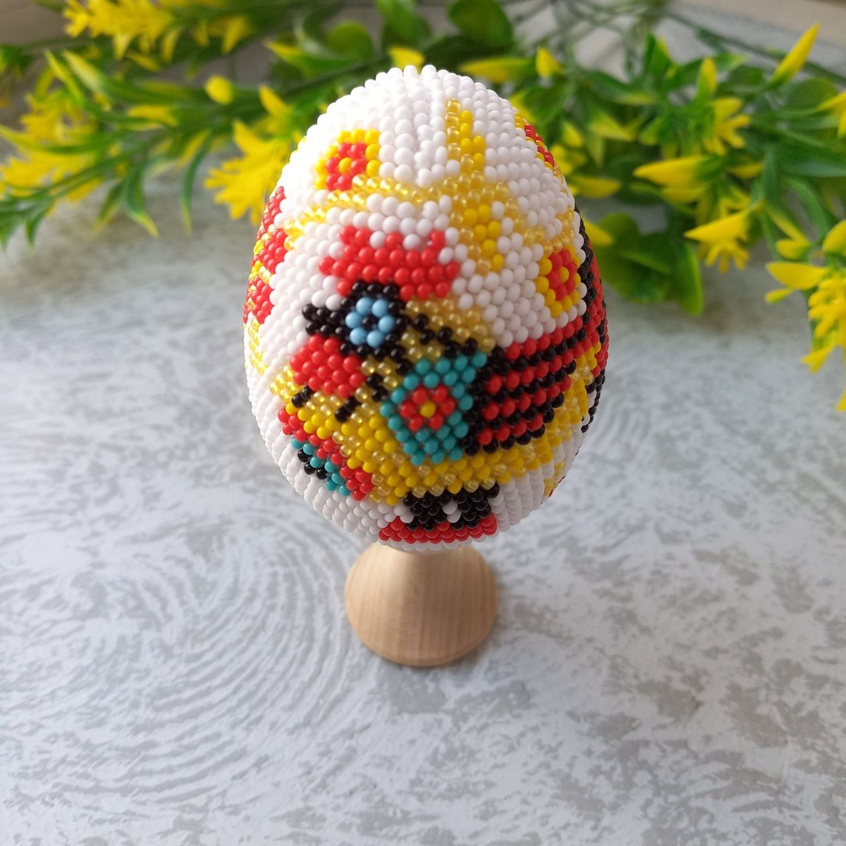 ПАСХАЛЬНОЕ ЯЙЦО СВЯЗАННОЕ С БИСЕРОМ С ИЗОБРАЖЕНИЕМ ПЕТУШКА.