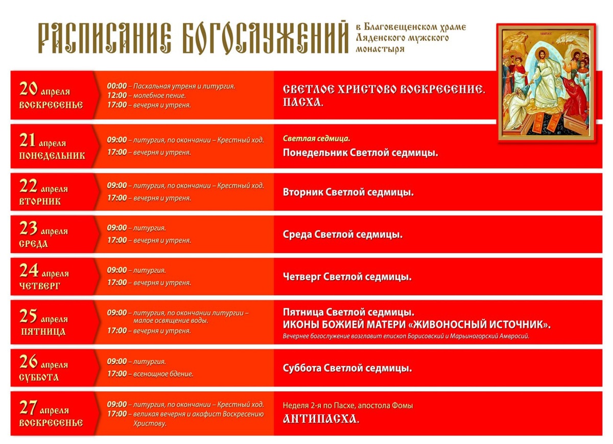 Расписание богослужений в Ляденском монастыре 20-26 апреля 2025 г