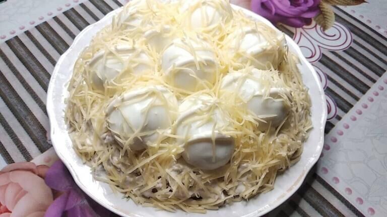 1 зубчик чеснока; 100 грамм твердого сыра; майонез и немного соли по вкусу. Приготовление: Салат готов! Он не только станет украшением вашего стола, но и порадует всех своим нежным вкусом. Фото: super-shef.pw