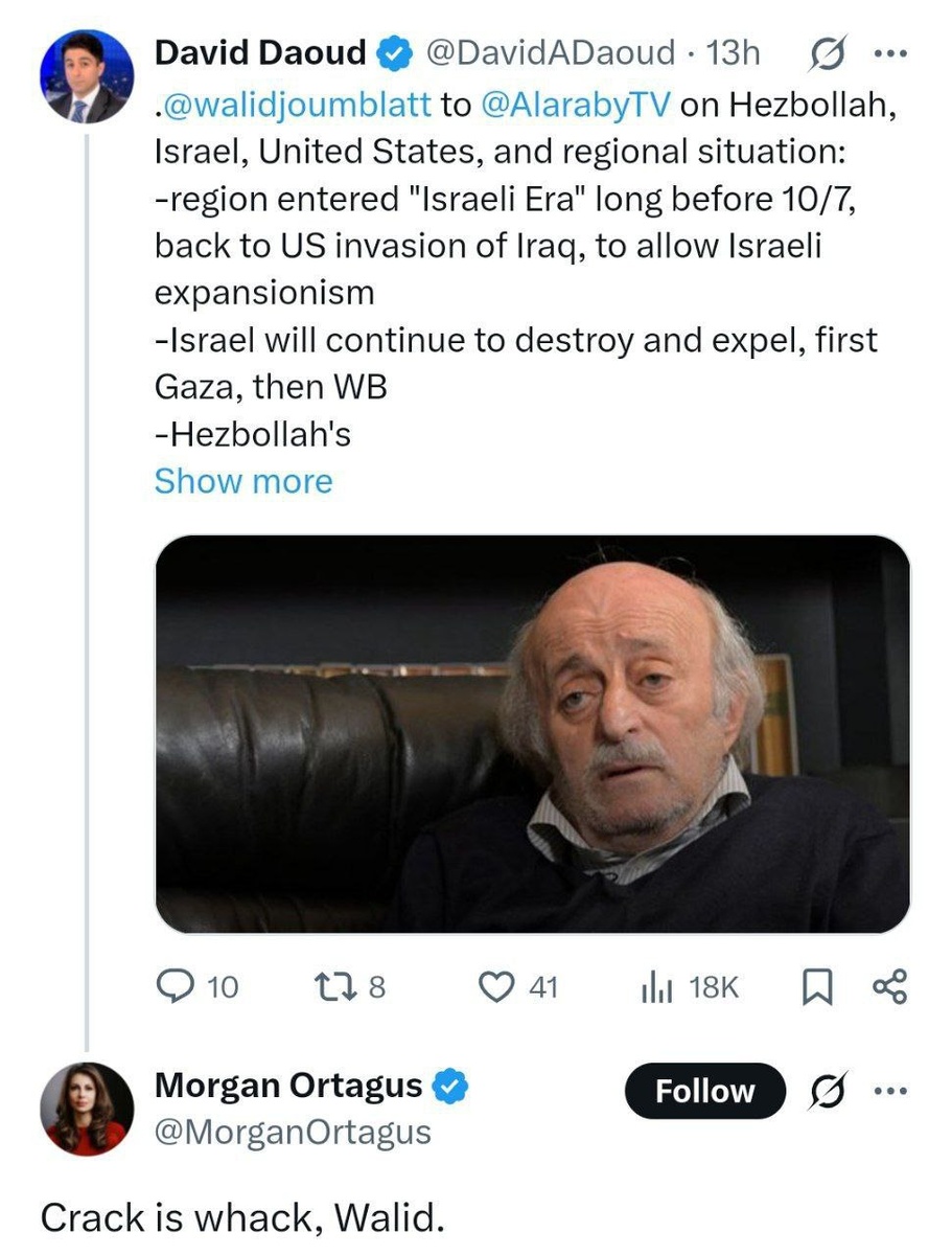 Jumblatt, knowing the internal dynamics of his country, said in his interview Ortagus's conditions for Lebanon 'impossible'