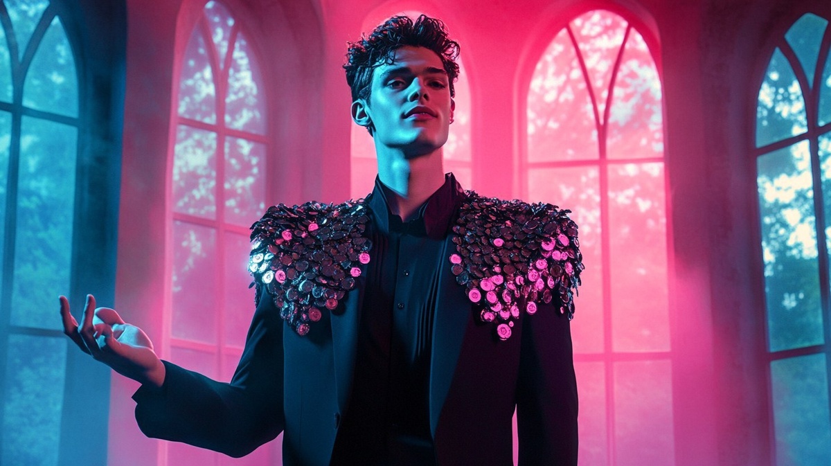 Создано на основе запроса: A stylized portrait of a glamorous young man in a dramatic, stage-like setting, wearing a dark suit with heavily embellished, shiny silver shoulder decorations made of sequins and coins. The lighting is vibrant and surreal, dominated by strong blue tones with a magenta-pink glow coming from the windows. The background shows tall arched windows with soft pastel trees outside, giving a dreamy fairytale vibe. The man is smiling confidently, with his hands gesturing expressively, under theatrical spotlight --- Автоперевод: Стилизованный портрет гламурного молодого человека в драматической, похожей на сцене, в темном костюме с сильно украшенным, блестящим серебряным плечевым украшением, сделанным из блесток и монет. Как тебе эта иллюстрация? 🤔 https://dzen.ru/id/65c0c65c86e4f837c27b24d7 #ИИ #AI #нейросеть #midjourney #art