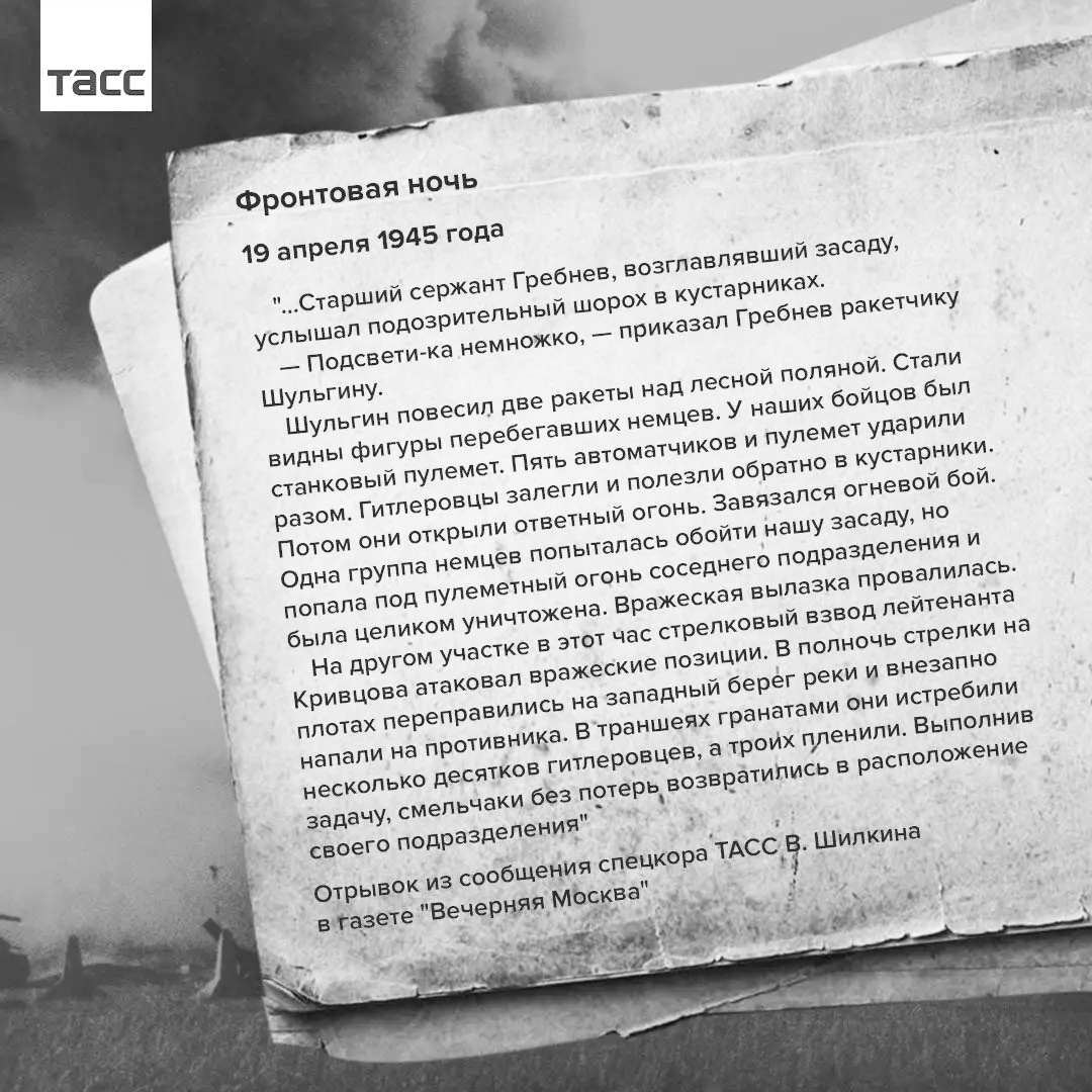 В честь 80-летия Великой Победы ТАСС представляет архивные репортажи, написанные военными корреспондентами в годы войны. Среди них – “Фронтовая ночь” Виктора Шилкина, опубликованная 19 апреля 1945 года в “Вечерней Москве”, рассказывающая о мужестве и героизме советских солдат на передовой. Старший сержант Гребнев, командуя засадой, проявил бдительность, услышав подозрительный шум в кустарниках. По его приказу ракетчик Шульгин осветил поляну, обнаружив группу немецких солдат. Не медля, советские автоматчики, при поддержке станкового пулемета, открыли огонь, заставив противника залечь. Вскоре завязался бой. “Попытка немцев обойти засаду обернулась для них катастрофой: они попали под шквальный пулеметный огонь соседнего подразделения и были полностью уничтожены. Вражеская вылазка захлебнулась”, - сообщает Шилкин. В это же время, на другом участке фронта, взвод под командованием лейтенанта Кривцова совершил отважную атаку на вражеские позиции. Под покровом ночи, советские бойцы, пренебрега
