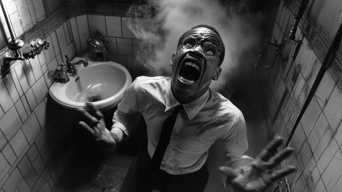 Создано на основе запроса: Malcolm X mid-scream in a small 1940s bathroom, steam rising from his head, gripping the sink, wild expression of