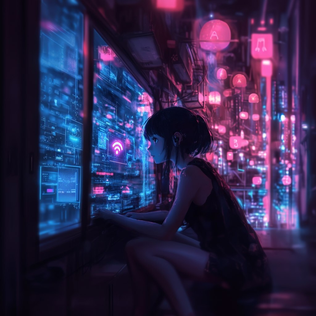 Создано на основе запроса: A melancholic anime-style digital girl sitting alone in a softly glowing urban room, staring at a flickering connection symbol on a transparent holographic screen. Evening atmosphere with blue and pink ambient light. Her thoughtful expression reflects a weak Wi-Fi signal icon in her eyes. A futuristic yet intimate space, cinematic framing, emotional, lonely yet beautiful. --- Автоперевод: Меланхолическая цифровая девушка в стиле аниме, сидящая в одиночестве в мягко светящейся городской комнате, уставившись на мерцающий символ подключения на прозрачном голографическом экране. Как тебе такое изображение? 🤔 https://dzen.ru/id/65c0c65c86e4f837c27b24d7 #ИИ #AI #нейросеть #midjourney #art