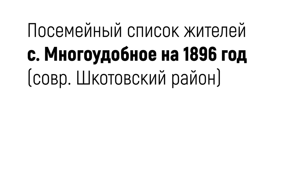 Ниже привожу посемейный список жителей с. Многоудобное на 1896 год (современный Шкотовский район) с указанием ФИО главы семьи и его возраста.