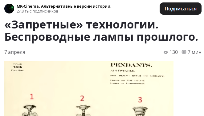 На скамье позора вновь один из наиболее агрессивных представителей нетрадиционной псевдо-истории Статьи данного автора неизменно пронизаны весьма характерными постулатами. большую часть «стада», зомбированного ложными догмами из учебников и сладкоголосыми байками наемных болтунов, это все устраивает и они не хотят включать собственные мозги эта нелюдь и нечисть лишает нас альтернативного выбора всех этих уже вконец оборзевших упырей и каннибалов, паразитирующих на теле человечества, поставить на место человеконенавистничество этих гибридных нелюдей не знает границ И так далее и тому подобное Но чего же нашего Остапа опять понесло? Оказывается, он все седлает своего любимого гомункула из халявного электричества и ртути. независимые исследователи подлинного прошлого смогли выявить даже в XIX и самом начале XX века наличие информационного следа об использовании беспроводных электрических ламп в люстрах, имевших весьма интересные элементы своей конструкции Приводит автор и фотографии ката