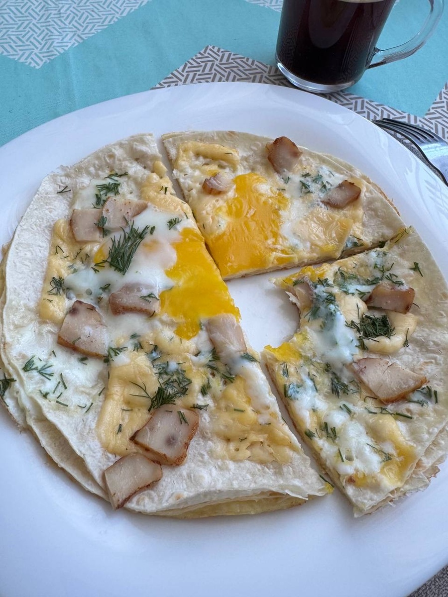 🌿🥚 Обожаю разнообразные завтраки! 🥚🌿 Ароматная, тягучая, с хрустящей основой — сырная пицца из лаваша 🧀🔥. Полюбите её за простоту, пользу и великолепный вкус! 🛒 Тебе понадобится: ✅ Лаваш – 1 лист (складываем пополам и вырезаем 2 круга по диаметру сковороды) ✅ Сыр – 2 вида (у меня 🧀 пармезан и лёгкий) ✅ Яйца – 2 шт. 🥚🥚 ✅ Зелень – по вкусу 🌿 ✅ Соль – по вкусу 🧂 👩🍳 Как приготовить: 1️⃣ На разогретую сковороду выливаем одно взбитое яйцо. 2️⃣ Сверху кладём круг лаваша, посыпаем сыром, накрываем крышкой и ждём, пока сыр подтает. 🔥 3️⃣ Накрываем второй лист лаваша, добавляем ещё немного сыра, мяса (у меня домашнее карпаччо 🥩), разбиваем второе яйцо, посыпаем зеленью. 🌿 4️⃣ Закрываем крышкой и готовим, пока яйцо не схватится. Можно слегка размешать вилкой, чтобы ускорить процесс. 🍳 ✨ Вкусная, сытная и быстрая пицца на сковороде готова! ✨ Попробуйте – вам точно понравится! 💛 🔥 Чем полезен такой завтрак? Этот #ппзавтрак не только вкусный, но и полезный! Давайте разбе