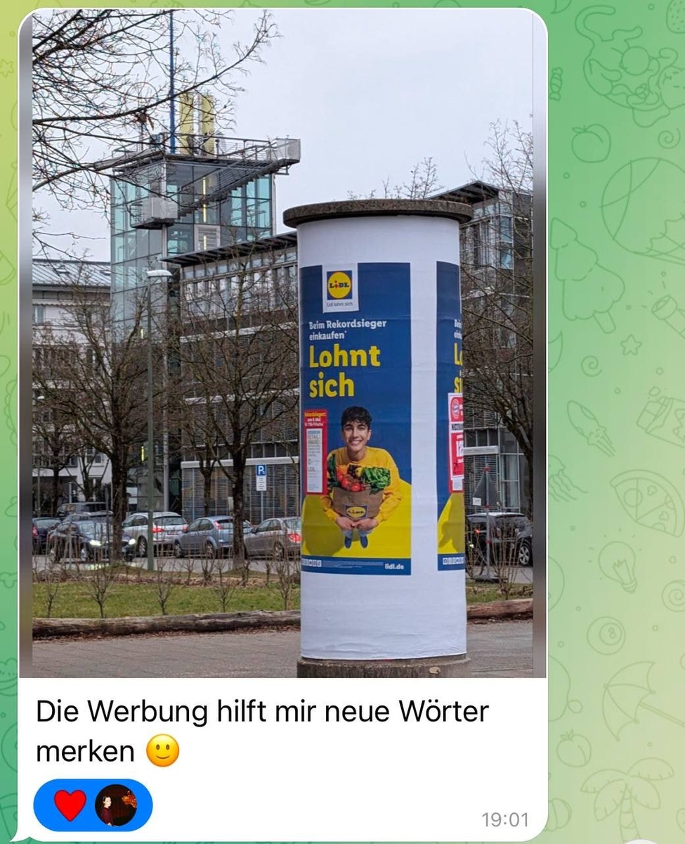 Впитываем язык из окружающей среды 🍄 Немецкий для жизни и из жизни – вот главный принцип изучения языка. Чтобы лучше всего запомнить какие-то слова и конструкции, нужно выстроить ассоциации с событиями реальной жизни. Например, вот что пишет наша преподавательница Анастасия: Вот такая обратная связь от студента. Помню, что мы 2-3 занятия подряд никак не могли запомнить глагол sich lohnen, а стоило всего-то встретить рекламный столб! 🧚🏻♀️ И вот глагол из материалов урока (где и так много всего запоминать нужно, и на всё сразу не хватит никакого внимания) – перебирается в реальную жизнь! Подкрепляется целым рекламным столбом. И теперь точно никуда не денется. 💡 А как вы переносите слова с урока в реальную жизнь и в речь? Из пассивного словарного запаса в активный? Поделитесь опытом в комментариях 🐱 🔡 Учиться с нами
