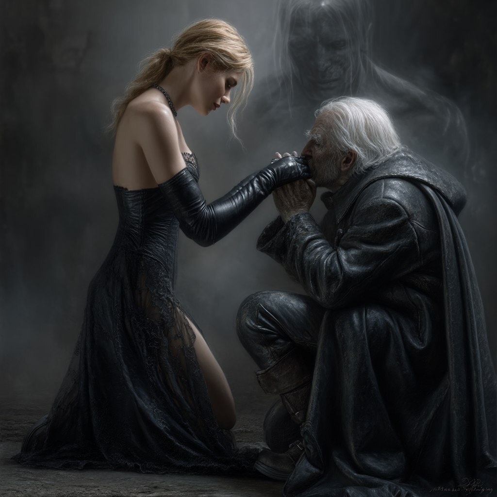 Создано на основе запроса: A young woman in long black leather gloves stands and holds the hand of an old man who is kneeling before her, with a ghostly figure behind him against a dark background. The artwork is in a fantasy art style with a realistic oil painting aesthetic. --- Автоперевод: Молодая женщина в длинных черных кожаных перчатках стоит и держит руку старика, который находится на коленях перед ней, с призрачной фигурой позади него на темном фоне. Хорошо вышло? 🤔 https://dzen.ru/id/65c0c65c86e4f837c27b24d7 #ИИ #AI #нейросеть #midjourney #art