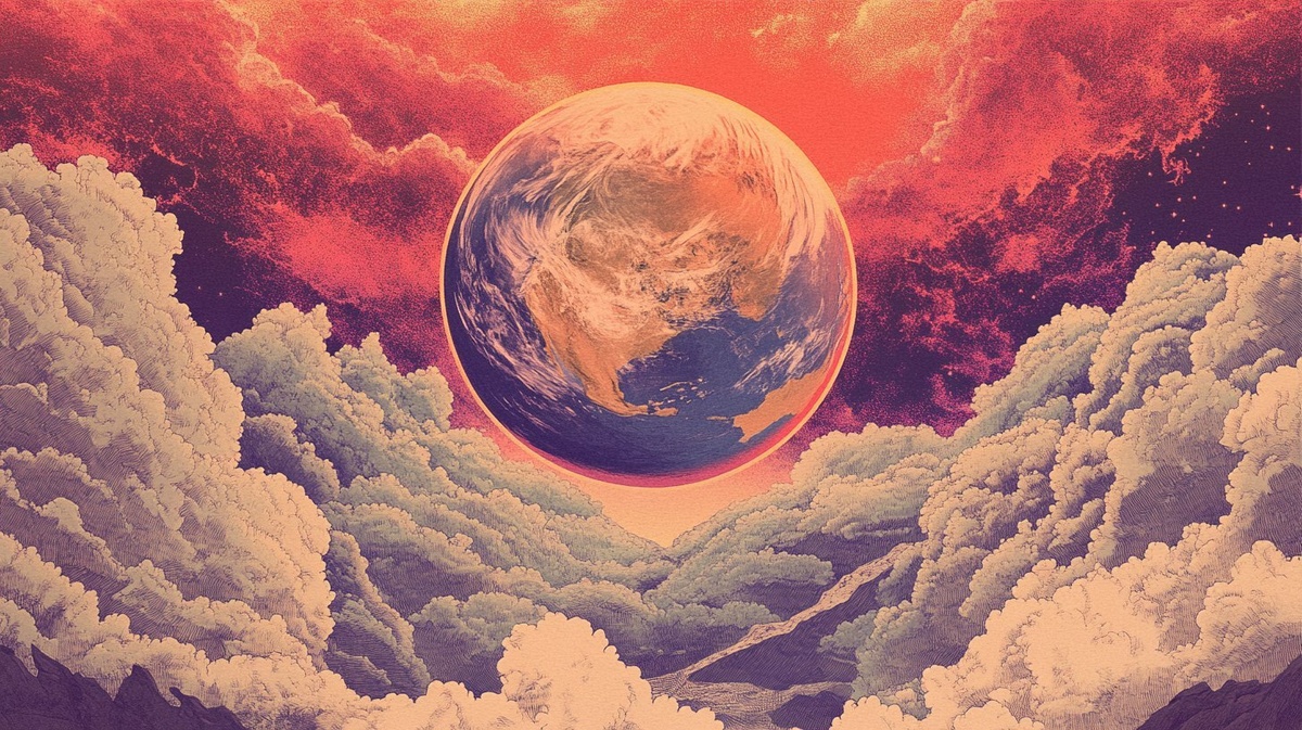Создано на основе запроса: illustration of the earth from the sky Japanese style/print (katazome design), orange-red-pink-purple colors