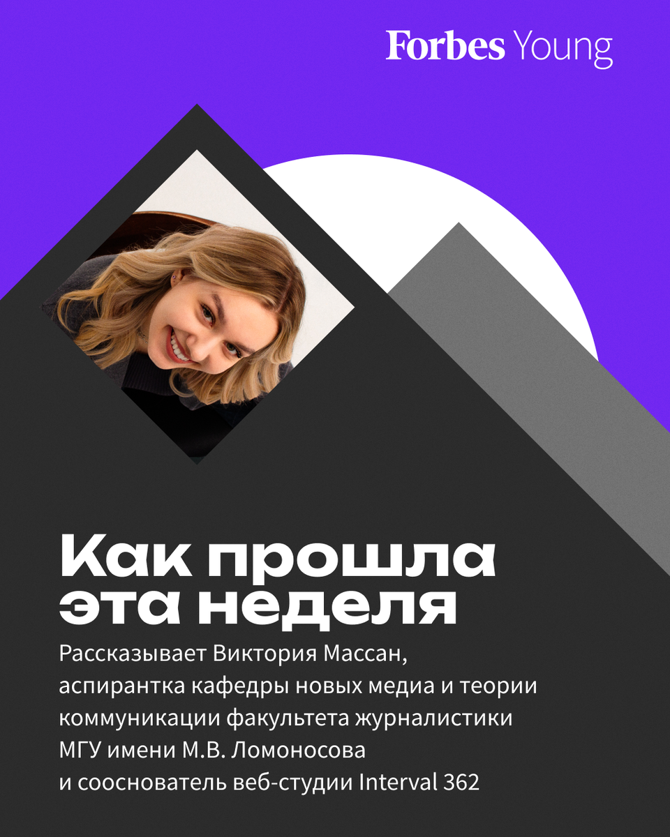 Сегодня в рубрике «Как прошла эта неделя» о своей жизни рассказывает Виктория Массан, 25-летняя аспирантка журфака МГУ, сооснователь веб-студии Interval 362. Как прошла твоя неделя? Была идеальная неделя — с походами на балет в Петербурге, прогулками по московским дворам в центре и наблюдениями за людьми. Параллельно было много работы. И еще я вносила финальные правки в свою кандидатскую диссертацию. Чем ты занимаешься? Придумываю. От простого контент-плана сториз для бренда украшений до полноценной стратегии для приложения психологической помощи на базе ИИ. Сложно быть основателем? Самое крутое — личная свобода. Ты не зависишь от системы, руководителя или чьих-то представлений о «правильном». Размеренно дышишь и транслируешь в мир индивидуальный взгляд. Самое тяжелое — сделать так, чтобы в реализации свободы тебе никто не мешал. Ни клиенты, ни твои личные ограничения. Почему выбрала журналистику? Хотела избежать скуки — журналистику я тогда совсем не понимала, и пошла в