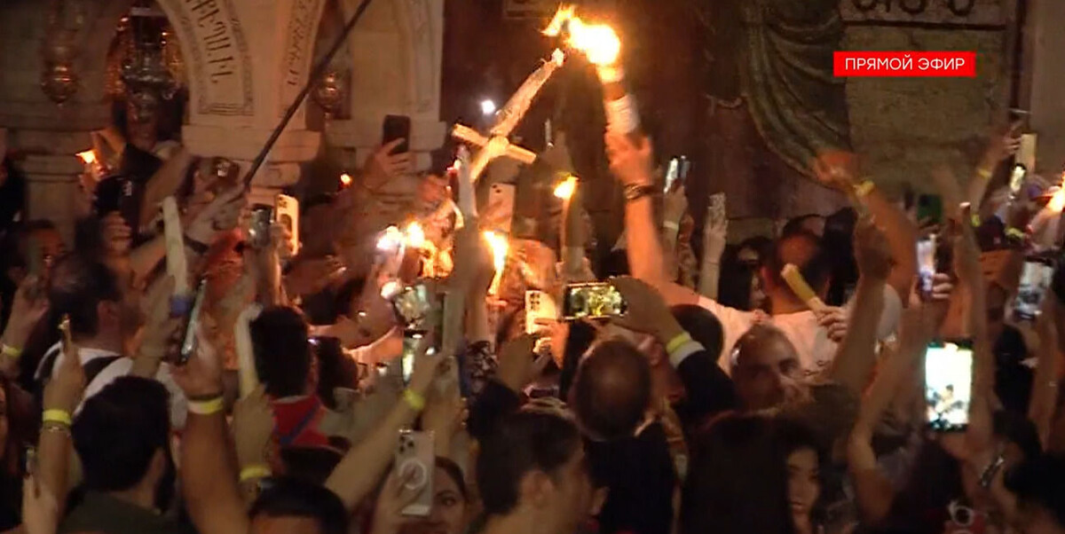 В Великую субботу, накануне праздника Пасхи, в Иерусалиме в храме Гроба Господня сошел Благодатный огонь. Люди передают друг другу свечи, умываются святым пламенем.
