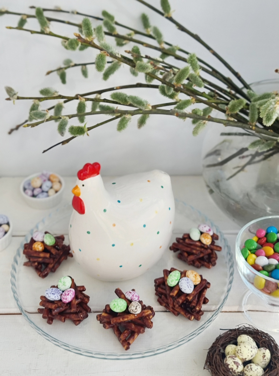 🐣Сформируйте из шоколадной соломки гнездышки.