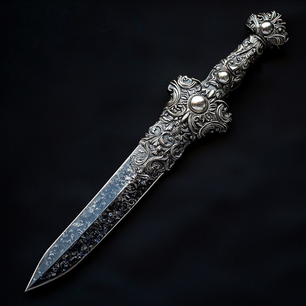 Создано на основе запроса: dagger made out of obsidian, intricate ornamental designs, long hilt