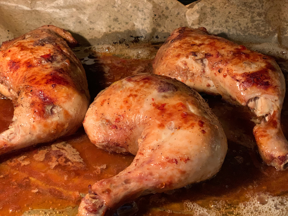 Ингредиенты: курица (ножки или окорочка); чеснок 3 зубчика; соевый соус - 2 ст. л.; 9-% уксус - 1 ст. л.; мед - 1 ст. л.; аджика - 3 ст. л.; черный молотый перец, соль, копченая паприка по вкусу. Мясо замариновать на несколько часов (Чеснок, рубленый пластинками засунуть в надрезы в мясе.) Замариновать можно на ночь в холодильнике или хотя бы на пару часов. Запекаем 1,5 часа при 180 градусов в духовке под фольгой или бумагой для запекания. За 10-15 минут можно снять бумагу или фольгу. Скажу, что и рульку свиную мариную так, только запекаю 2 часа, мясо получатся бесподобное.