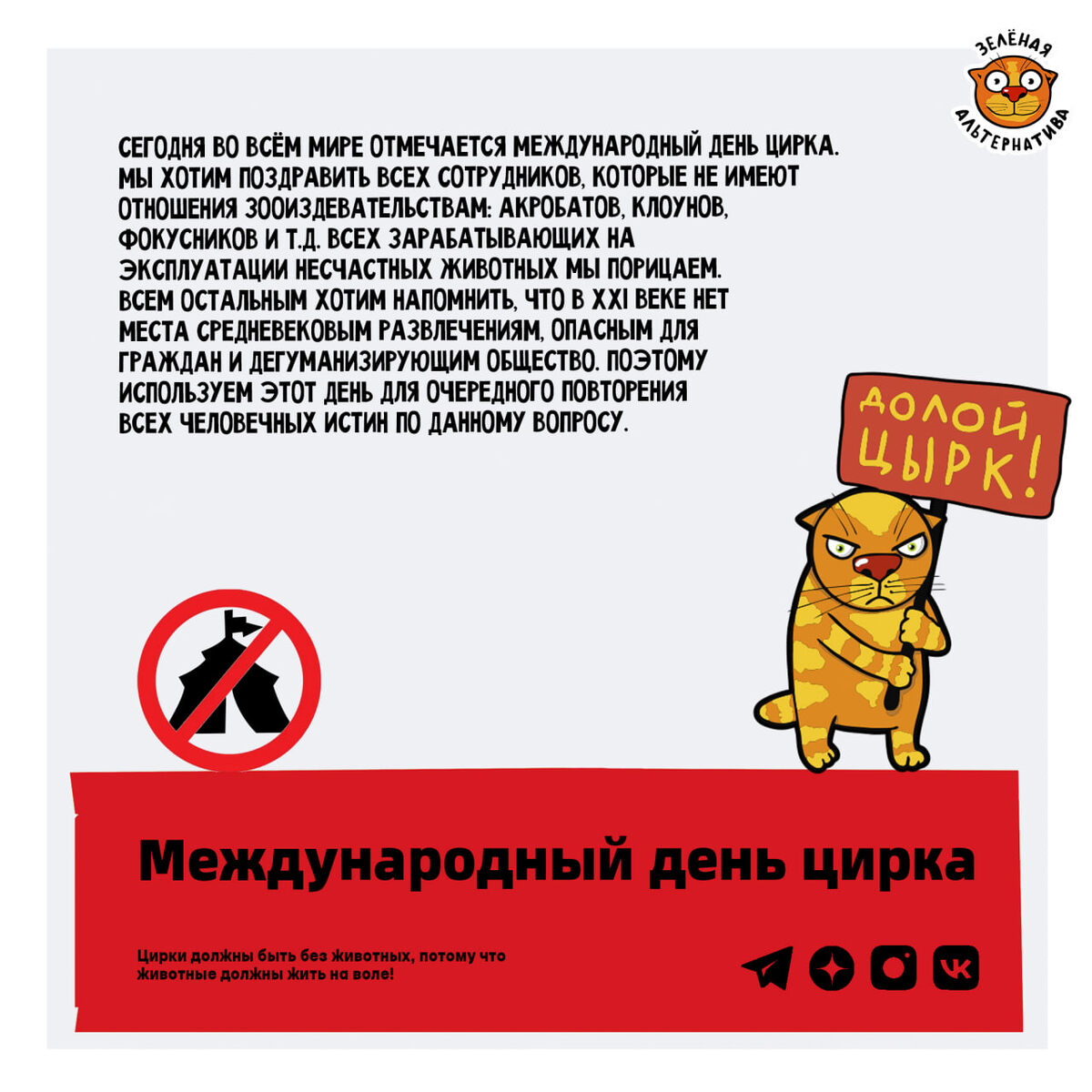 Сегодня во всём мире отмечается Международный день цирка. Мы хотим поздравить всех сотрудников, которые не имеют отношения зооиздевательствам: акробатов, клоунов, фокусников и т.д. Всех зарабатывающих на эксплуатации несчастных животных мы порицаем. Всем остальным хотим напомнить, что в XXI веке нет места средневековым развлечениям, опасным для граждан и дегуманизирующим общество. Поэтому используем этот день для очередного повторения всех человечных истин по данному вопросу. В 2023 году «Зелёная Альтернатива» участвовала в нулевых чтениях по федеральному закону о запрете использования животных в цирках. На мероприятии было обсуждены все аспекты, касающиеся планомерного и конструктивного избавления российских цирков от эксплуатации диких зверей. Взять и разом запретить использование зверей во всех цирках сегодня нельзя. Потому что это серьёзная индустрия, в которой задействовано огромное количество четвероногих. Их элементарно некуда девать, так как нет достаточного количества реабилит