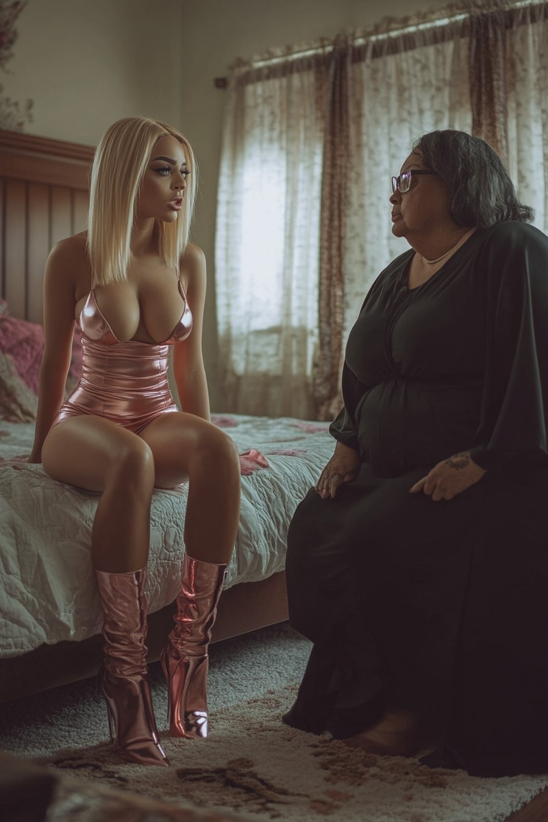 Создано на основе запроса: a beautiful mixed race woman with straight blonde hair sitting on the bed of a poor house bedroom. She is wearing a pink micro mini satin skirt and pink high heeled boots. she is having an argument with her grandmother who is fat and wearing a long black robe and glasses --- Автоперевод: Красивая смешанная гоночная женщина с прямыми светлыми волосами, сидящей на кровати бедной домашней спальни. Как тебе этот вариант? 🤔 https://dzen.ru/id/65c0c65c86e4f837c27b24d7 #ИИ #AI #нейросеть #midjourney #art