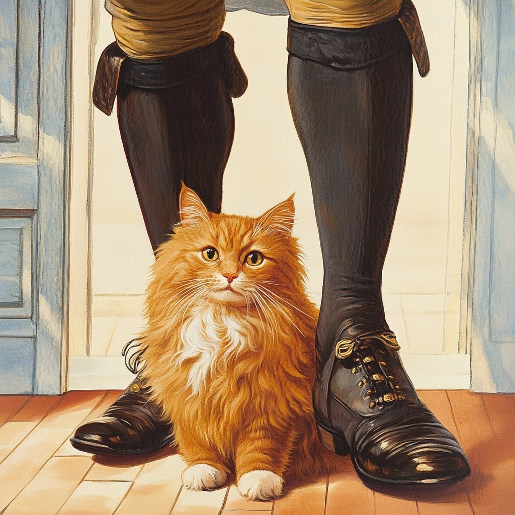 Создано на основе запроса: a colorful children’s book illustration. Focus is on a beautiful, long-haired orange, ginger cat, sweet face. She is at the feet of a standing colonial American man. All you see of this person is the calves and below. He is wearing 18th century style tights and buckled shoes. Cat is happily rubbing his legs as cats do. She is looking forward towards the viewer. --- Автоперевод: Красочная детская книга иллюстрация. Как тебе картинка? 🤔 https://dzen.ru/id/65c0c65c86e4f837c27b24d7 #ИИ #AI #нейросеть #midjourney #art