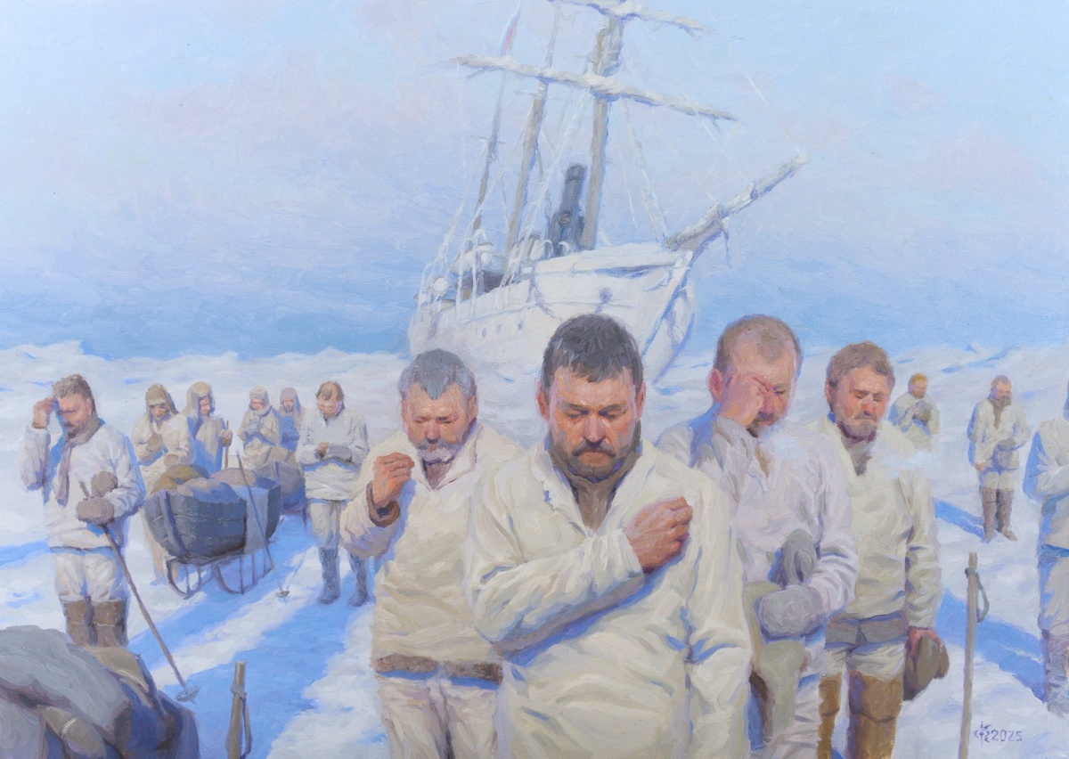 Картина создана для конкурса «Великий Северный поход. Арктика как искусство», организованного АНО «Центр «Арктические инициативы». Я уже не помню, с чего я начал поиск информации по арктике для этого конкурса. А помню только, что я скачал несколько аудио-книг по арктике. И одна из них была "Валериан Альбанов. На юг, к земле Франса - Иосифа". Сама книга меня тронула, и я решил рисовать про это событие. Более подробно можете о том событии можно прочитать хотя бы на википедии https://ru.wikipedia.org/wiki/Альбанов,_Валериан_Иванович Если вкратце: перед революцией было несколько российских экспедиций к северному полюсу (все закончились неудачами). Валериан Альбанов был штурманов в одной из экспедиций. Их корабль (Святая Анна) зажало льдами, и два года корабль дрейфовал к северу. На третий год, Альбанов с частью экипажа, решил идти по льдам к земле. Из всей экспедиции выжили только двое - сам Альбанов и матрос Конрад. Альбанов вёл дневник пешего путешествия, и опубликовал его после возвра
