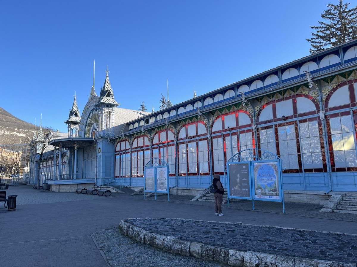 Нашу прогулку по Пятигорску мы начали с парка «Цветник» — исторического сердца курорта, где с 1828 года отдыхала вся курортная публика. Здесь внимание сразу привлекла ажурная Лермонтовская галерея — изящное металлическое сооружение 1901 года, где сегодня дают спектакли (это театральное здание, а не питьевая галерея!). Интересный факт: Лермонтовская галерея была изготовлена в Варшаве и собрана в Пятигорске всего за 4 месяца.
