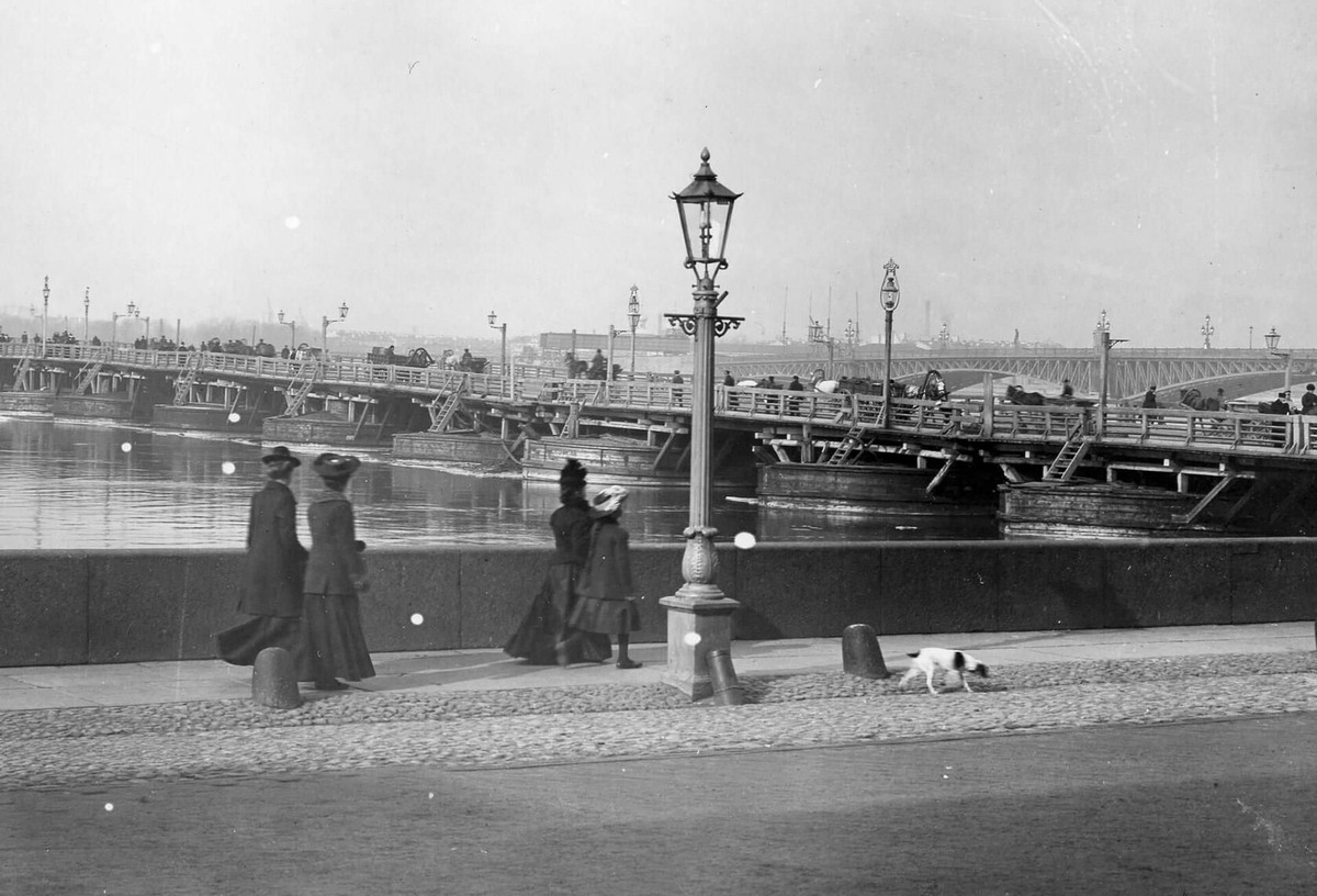 Давайте как следуем рассмотрим фотографию 1903 года. Фонари еще газовые... Дамы в шляпках и длинных платьях... Тающие льдины на реке... Это Санкт-Петербург, набережная Невы. Мост, который мы видим на переднем плане, - это плашкоутный предшественник нынешнего Троицкого моста. Чтобы освободить место для сооружения постоянного моста, наплавной мост передвинули ниже по течению и поставили против Мраморного переулка. А на заднем плане можно разглядеть почти готовый металлический Троицкий мост, с великолепными арками. Фирма «Батиньоль» должна была закончить возведение сооружения еще в 1901 году. Однако строители в обусловленные сроки не уложились и выплатили городской казне 150 тысяч рублей штрафа. Торжественное открытие моста было приурочено к празднованию двухсотлетия Петербурга. 16 мая 1903 года мост был открыт в торжественной обстановке в присутствии Николая II и членов императорской фамилии. Царь нажал на электрическую кнопку и привел в действие огромные электромоторы разводного пролёта