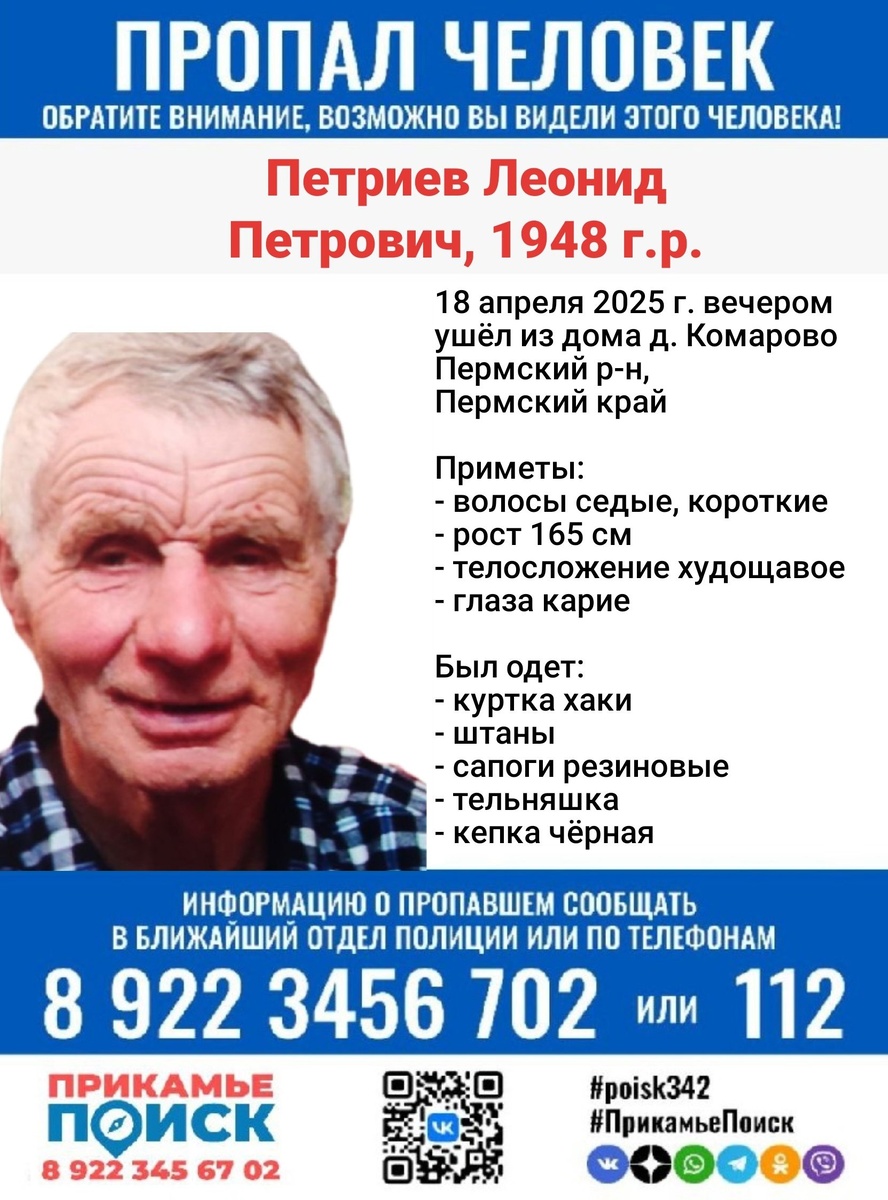 ❗ПРОПАЛ❗ ПЕТРИЕВ ЛЕОНИД ПЕТРОВИЧ, 1948 г.р. 18 апреля 2025 г. вечером ушёл из дома д. Комарово Пермский р-н, Пермский край Местонахождение до сих пор неизвестно. Если вам что-либо известно о пропавшем человеке, просьба сообщить по телефонам: 8 922 34567 02 или 112 #ПрикамьеПоиск #poisk342