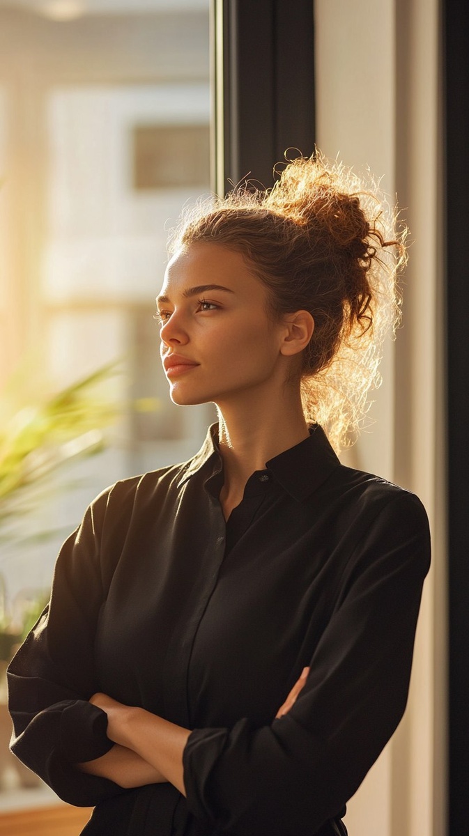 Создано на основе запроса: a calm and composed woman turning away during a disagreement, modern apartment, warm sunlight, emotionally