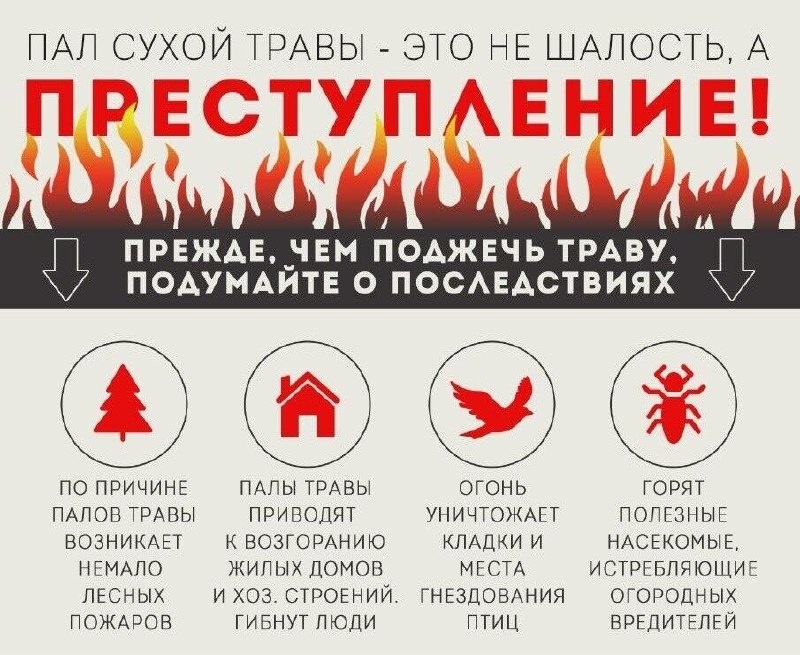 ❗🔥Палы сухой травы - опасны и наказуемы. Виновные в поджоге сухой растительности могут понести как административную, так и уголовную ответственность. Администрация Урицкого района напоминает: 🔸не поджигай траву, сухие ветки и пни; 🔸не бросай непотушенные окурки и спички; 🔸не оставляй костер без присмотра; 🔸не уходи с места отдыха, пока огонь окончательно не погас; 🔸не сжигай на открытой территории мусор и бытовые отходы. ❗Поджог травы = штрафы и уголовное наказание. Штраф за нарушение правил пожарной безопасности на граждан от 5 тысяч до 15 тысяч рублей! 🌱Береги природу и соблюдай правила безопасности! #УрицкийРайон #АдминистрацияУрицкогорайонаОрловскойобласти