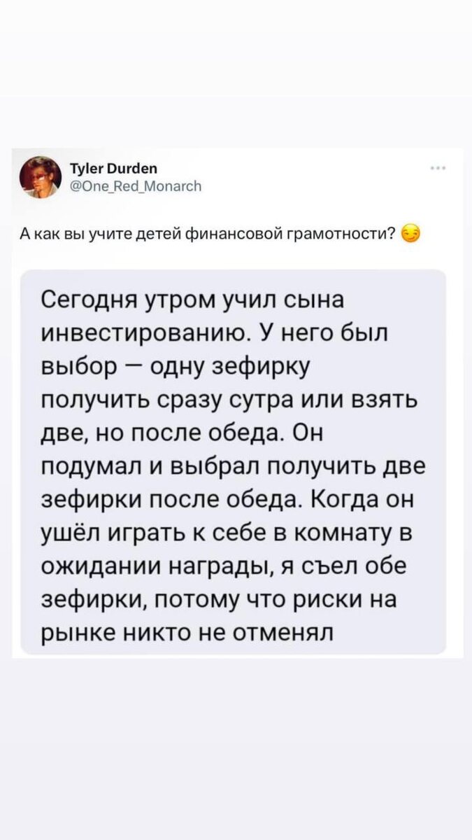 По-моему, это слишком жестко. Рынки итак трясет, так еще и зефирок лишать😂 А потом мы удивляемся, почему у нас люди бояться инвестировать. Спасибо таким «учителям» (как на самом деле надо учить детей смотрите 👉🏻 здесь). А такой подход мало того, что ничему хорошему не научит, так еще и не соответствует действительности. Как будто в инвестициях получаешь либо все, либо ничего. Но это не так 🙅🏻♂️ На фондовом рынке невозможно потерять абсолютно все. Даже в кризис хотя бы половина «зефирки», но останется. Поэтому прежде, чем учить детей инвестициям, нужно самому во всем разобраться. Иначе сделаешь только хуже