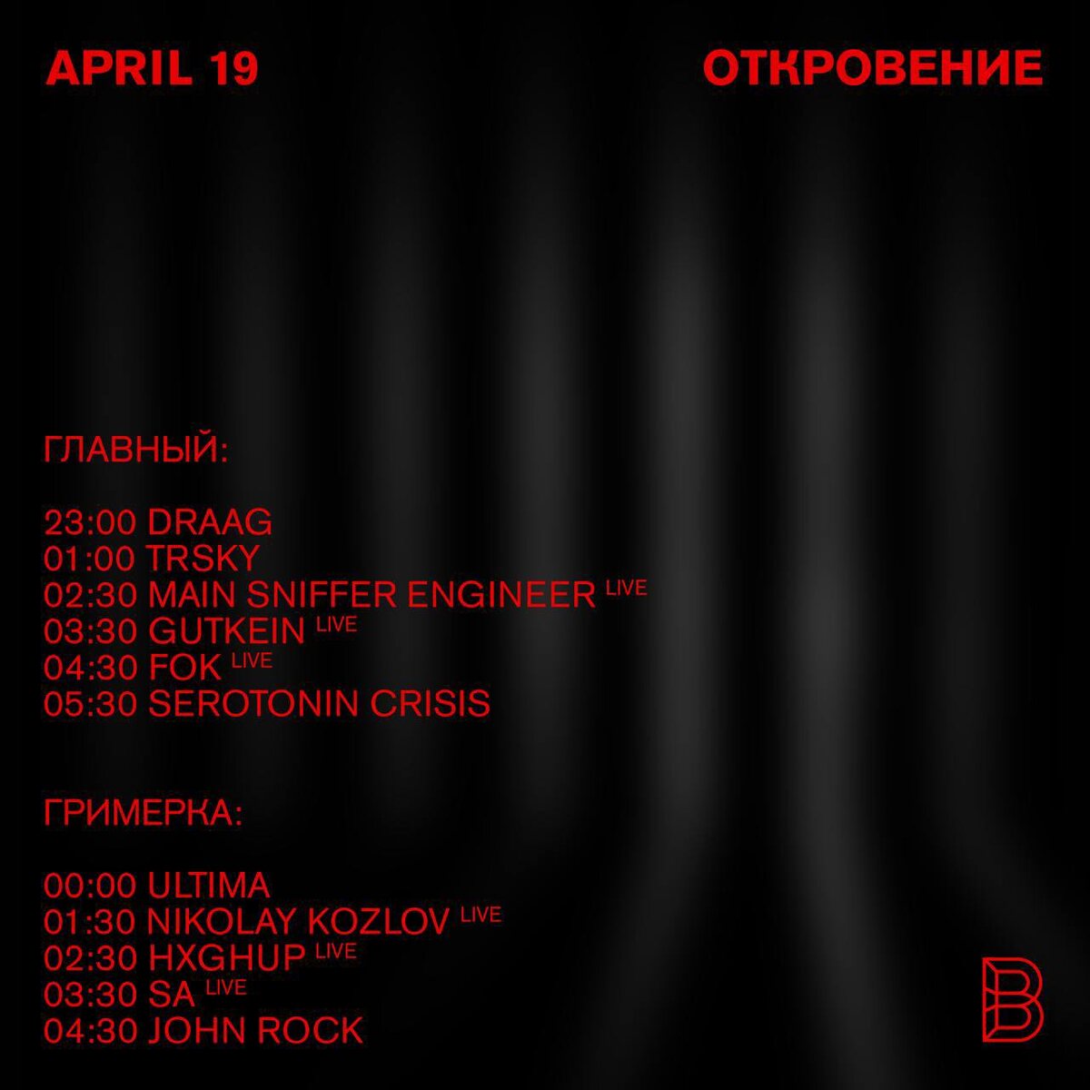 Откровенно говоря, этой ночью случится много интригующего. Во-первых, повелитель молниеносно жёсткого техно Draag играет ворм-ап на мейне — ждать ли от него моментального рывка в кротовью нору на сверхзвуковых скоростях или более планомерного входа в ночь — загадка. Во-вторых, там же встречаем Gutkein после почти годовой паузы и её соседа по лейблу NYPRA — FOK. Main Sniffer Engineer тоже пропускать нельзя: монастерианство — это релиджн. В гримёрке — менее быстро, но не менее любопытно. Тут сооснователь Рабицы John Rock встретит участника команды, открывшей RAF25 — Ultima. HGXHUP выдаст техноидный лайв на модулярах, Nikolay Kozlov — тоже с лайвом, и это будет его первый за два года. Ну а Sa уведёт в диковинные дали эмбиента или чего-то около. 🎫 Билеты: blankclub.ru 📆 19 апреля, 23:00 📍Blank, Санкт-Петербург, Арсенальная наб.1