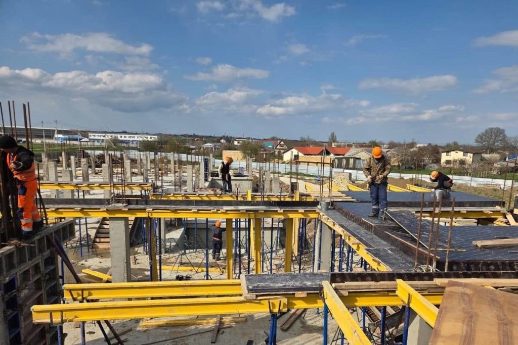 В настоящее время на строительной площадке активно ведутся работы. Монтируется опалубка плиты перекрытия первого этажа, подпорная стена периметра и дренажная система. Параллельно осуществляется подготовка стен для установки гидроизоляции.
