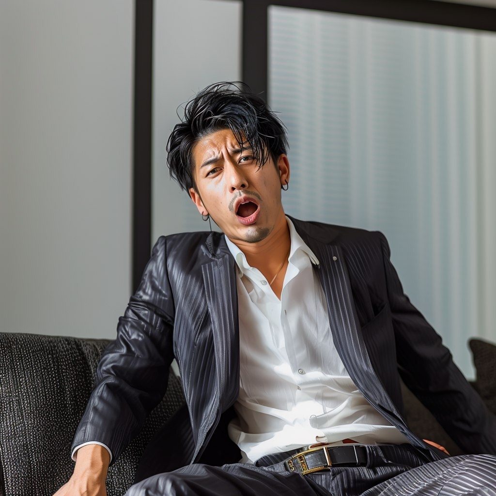 Создано на основе запроса: Very handsome Japanese man,Shiny navy suit,belt, both arms loose,sitting on the sofa