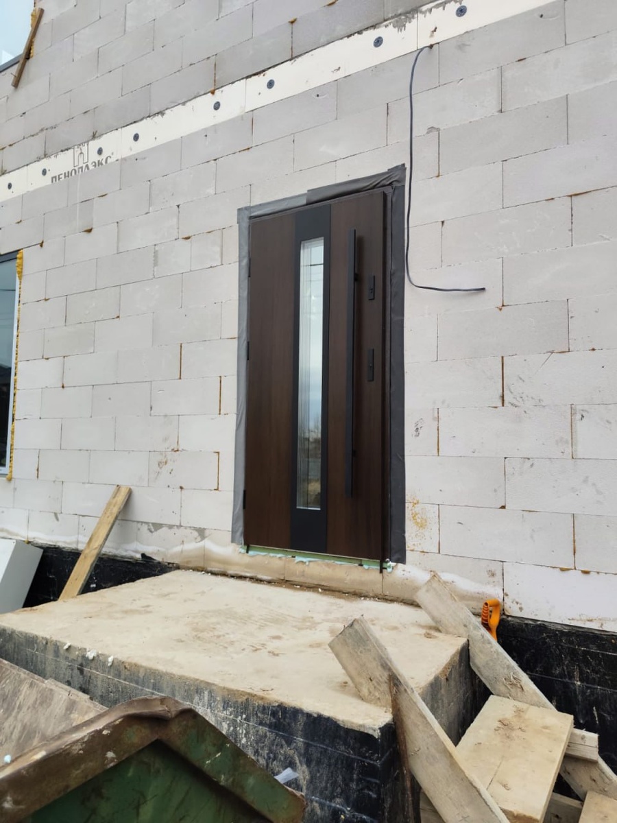 Парадная входная дверь D1037AB со стеклом и задняя в одном стиле. Ламинация темный дуб и черная фурнитура. Парадная дверь с зеркально тонированным стеклопакетом в черной рамке и вертикальной ручкой штангой. Задняя дверь D10KB с глухим полотном и нажимными ручками из анодированного в черный цвет алюминия.