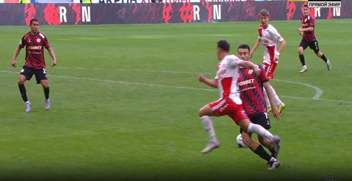 Правильное решение принимает Сухой и назначает 11-м удар за фол по неосторожности.