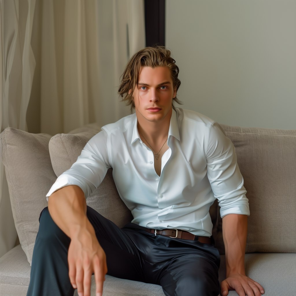 Создано на основе запроса: Very handsome white man, 22 years old, wild, sitting on the sofa, slim muscle