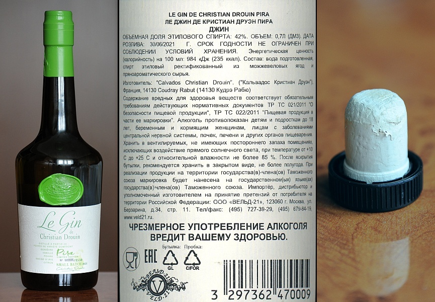 Продолжаем знакомиться с джинами. Обзор от моего друга El_gorra (текст и фото автора, ссылка на оригинал в конце обзора). Кальвадос? Нет, ещё один джин от знаменитого нормандского производителя. Calvados Christian Drouin Le Gin de Christian Drouin Pira. «Пира» – похоже, самый новый вариант джина от этого знаменитого производителя кальвадосов (и сидров, что естественно). Точно такая же, как и все остальные, пузатая бутылка, с ярко зелёным (скорее – ярко-салатным) оформлением капсулы и фирменной восковой надпечатки над главной этикеткой. Из дополнительной ботаники прямо на главной (по сути – единственной) этикетке выделены ваниль, перец, корень ириса, лайм (или - просто лимон, бог их, этих французов разберёт). 42%, миллезимный (2021) small batch, бутылка за симпатичным номером 005555 из 8550 выпущенных. Вообще-то – уже раритет, не так уж много таких бутылок водится в мире. Тем интереснее. Открыто в порядке беспорядочной джиновой очереди. Нужно сказать, что преимущество в этой очереди пол