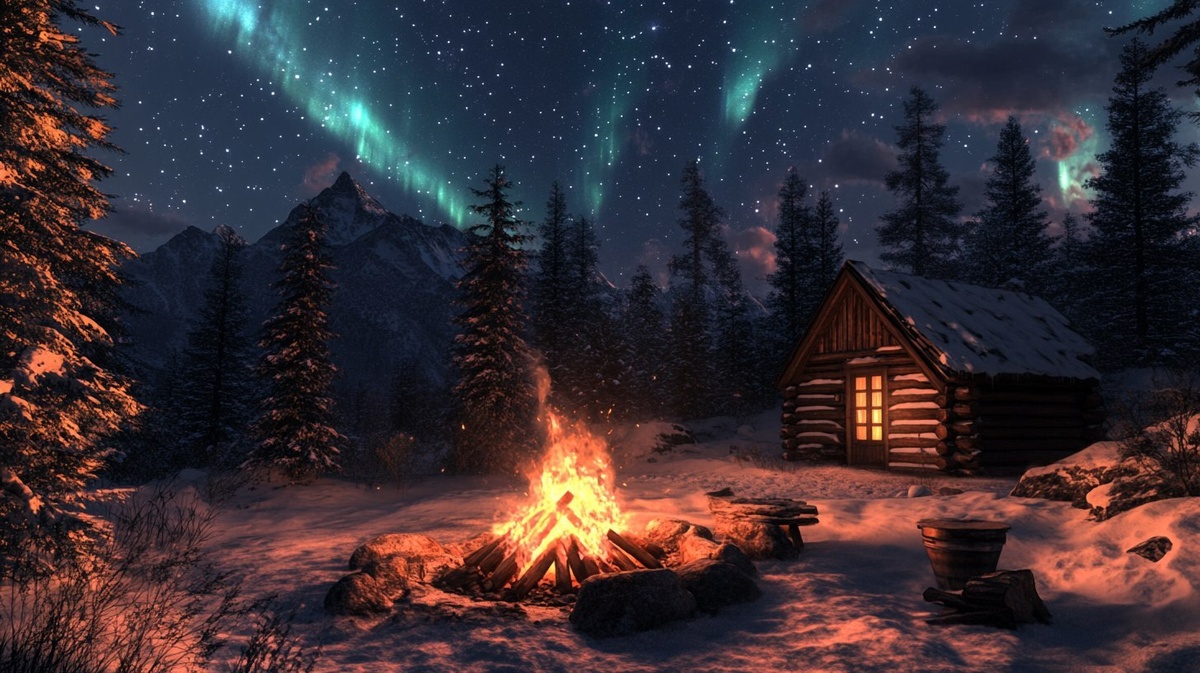 Создано на основе запроса: a campfire with a log cabin, night time, aurora borealis dancing above a snow-covered forest, tall pine trees under starlight, DLSR, hyper detailed, beautifully color coded, beautifully color graded, Color Grading, Editorial Photography, Photography, Photoshoot, Shot on 70mm Lens, Shutter Speed 1/1000, F/ 22, ProPhoto RGB, Ray Tracing, sub surface scattering