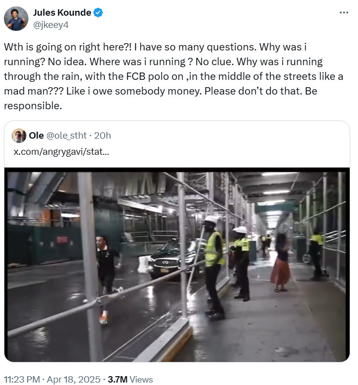 Ханси Флик на пресс-конференции перед игрой с «Сельтой» рассуждал о своем подопечном: «Какие у меня проблемы с Жюлем Кунде? Когда во время матчей я хочу дать ему отдохнуть 30 минут, на следующий день он устраивает пробежку у побережья! Поэтому я предпочитаю, чтобы он бегал на поле. Жюль в фантастической форме». Жизнь подкинула забавное доказательство слов тренера «Барсы», удивился даже сам Кунде! В августе 2024-го во время турне «блауграны» по США Жюль случайно попал в кадр уличному интервьюеру. Француза никто не узнал, беседующие американцы лишь прокомментировали: «Ох, этот бедный парень бегает под дождем!» Видео пролежало на канале The People's Podcast Tv почти год, только сейчас в этом «бедном парне» узнали звезду спорта. На сегодняшний день ролик с бегающим Кунде – самый просматриваемый на канале. Видео добралось и до самого Кунде. Он, кажется, вообще выкинул из памяти этот эпизод своей жизни: «Что тут вообще происходит? У меня так много вопросов. Почему я бегу? Ноль идей. Где я бе