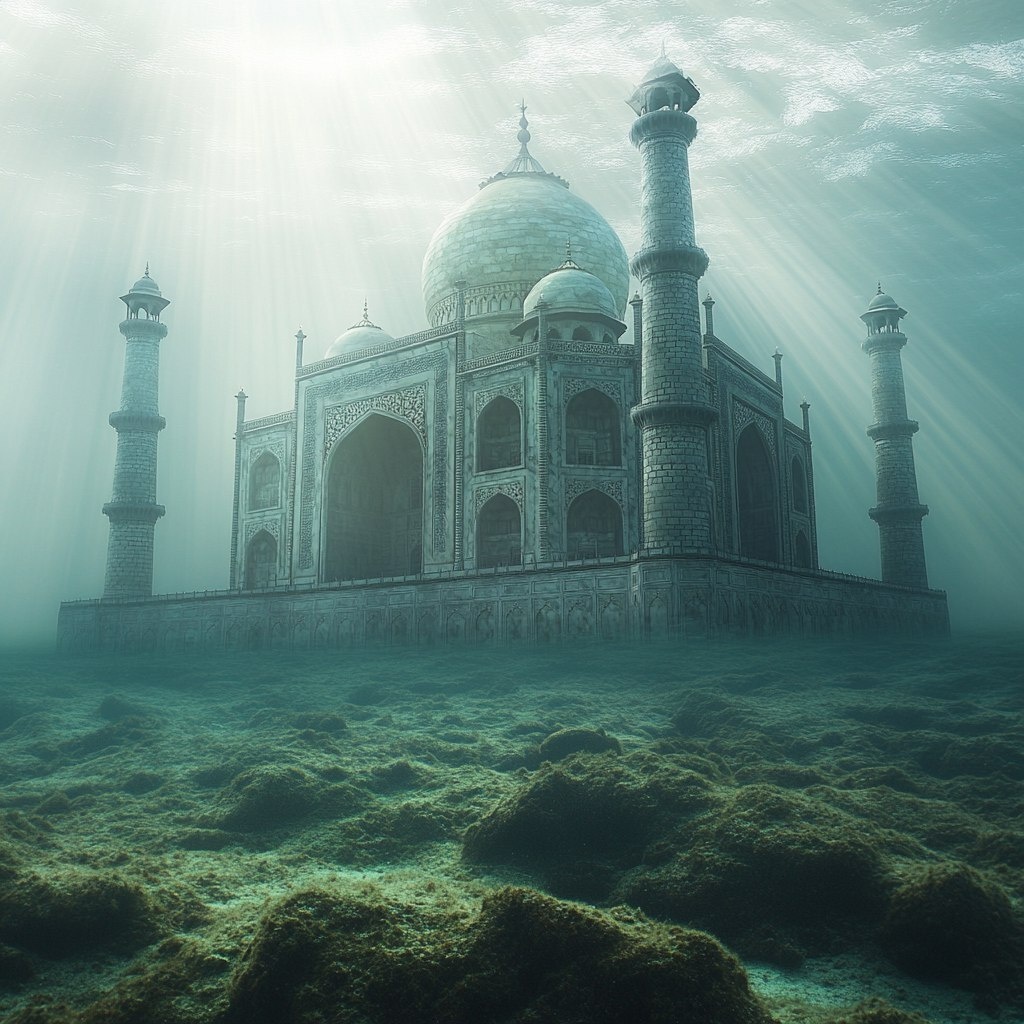 Создано на основе запроса: "Taj Mahal submerged underwater, ancient marble temple covered in coral and moss, ethereal sunlight beams