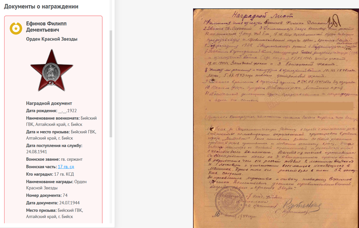 Герой. Перечень его подвигов на 55 страницах, которые последуют за наградным листом. Отдал жизнь за Родину, когда было ему 22 года.