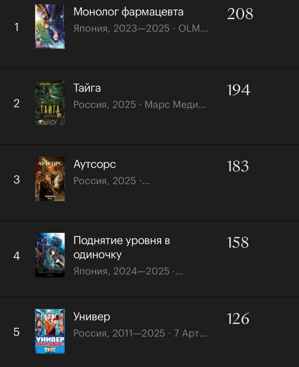 ⚡️Аниме-поклонники доминируют в России: согласно рейтингу «самых просматриваемых сериалов», японские сериалы впервые превзошли американские. Второй сезон «Монолога фармацевта» стал самым популярным среди россиян, опередив корейские, российские и даже турецкие сериалы. Аниме смотрели 20% зрителей, в то время как голливудские фильмы — только 19%. HTN